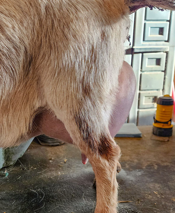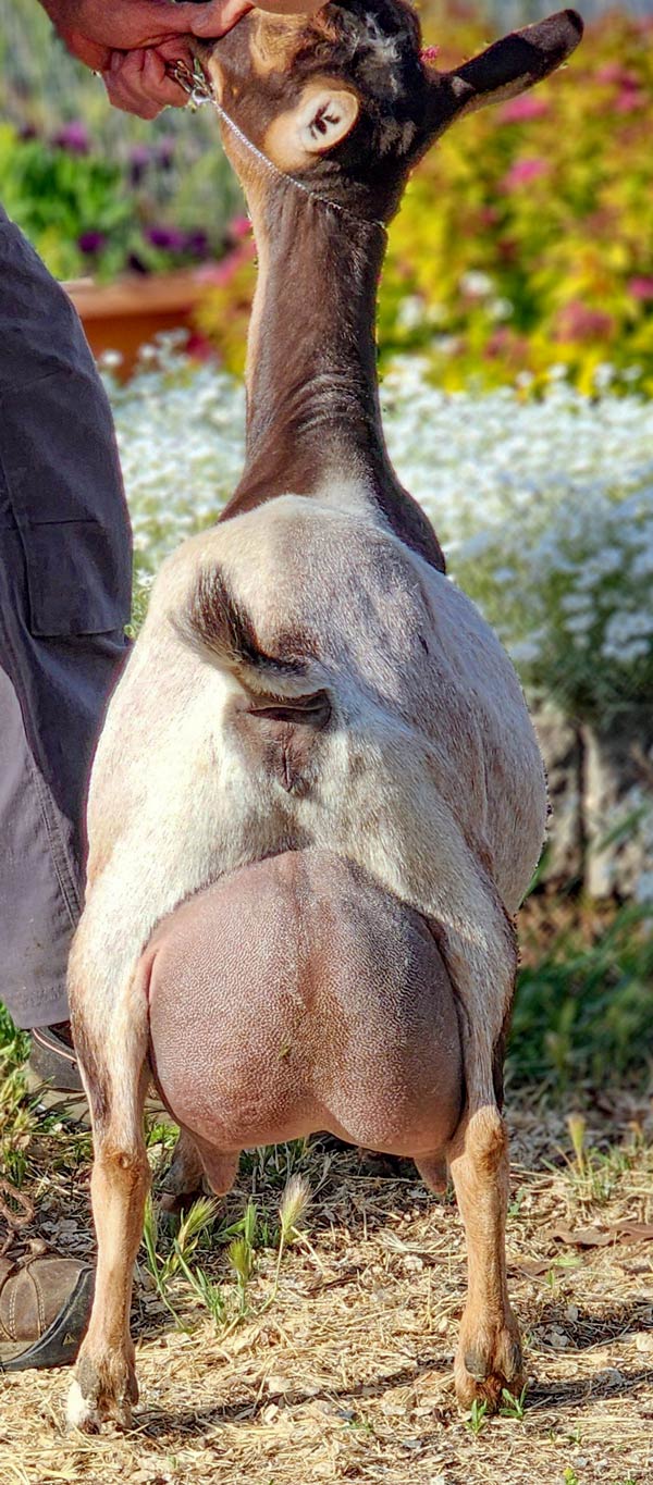 Zinnia is the lovely daughter of TUA Farms MB Lilliana 2*M VVEE90 and Woodbridge Farm Promise Kept. Zinnia is maturing nicely and is a smaller stature doe but very nice and wide throughout, like her dam. Zinnia has a sweet personality and loves human interaction. Zinnia will be kidding in Feb 2024 as a 2yoFF.